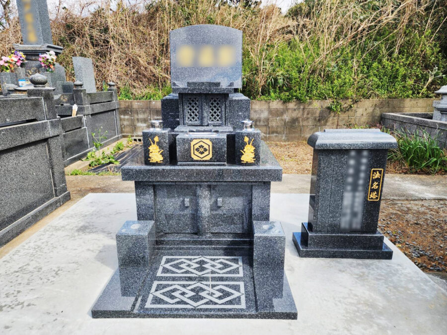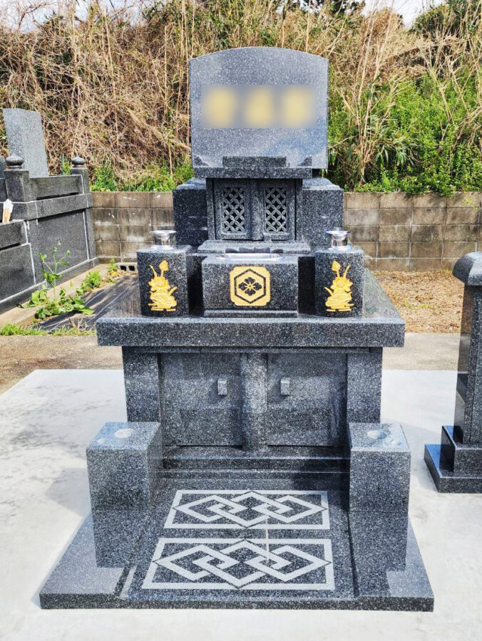 墓石は安定感のある洋型タイプをお選びいただきました。香炉扉の七宝柄と蓮の彫刻が華やかさを演出しています。
